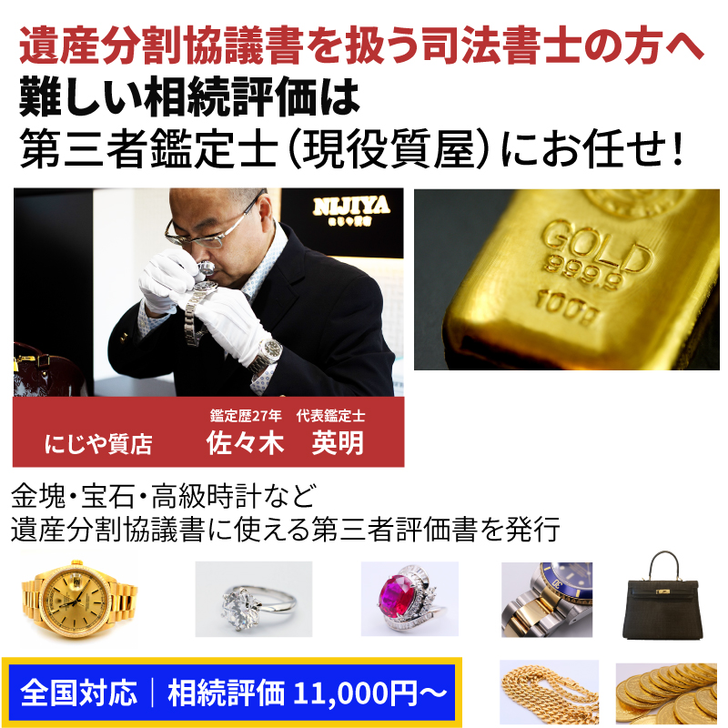 現役質屋(にじや質店)の実務相場データと、X線分析・比重測定等の科学的データを併記した「第三者評価書」として、司法書士実務の説明資料としてご利用いただけます。